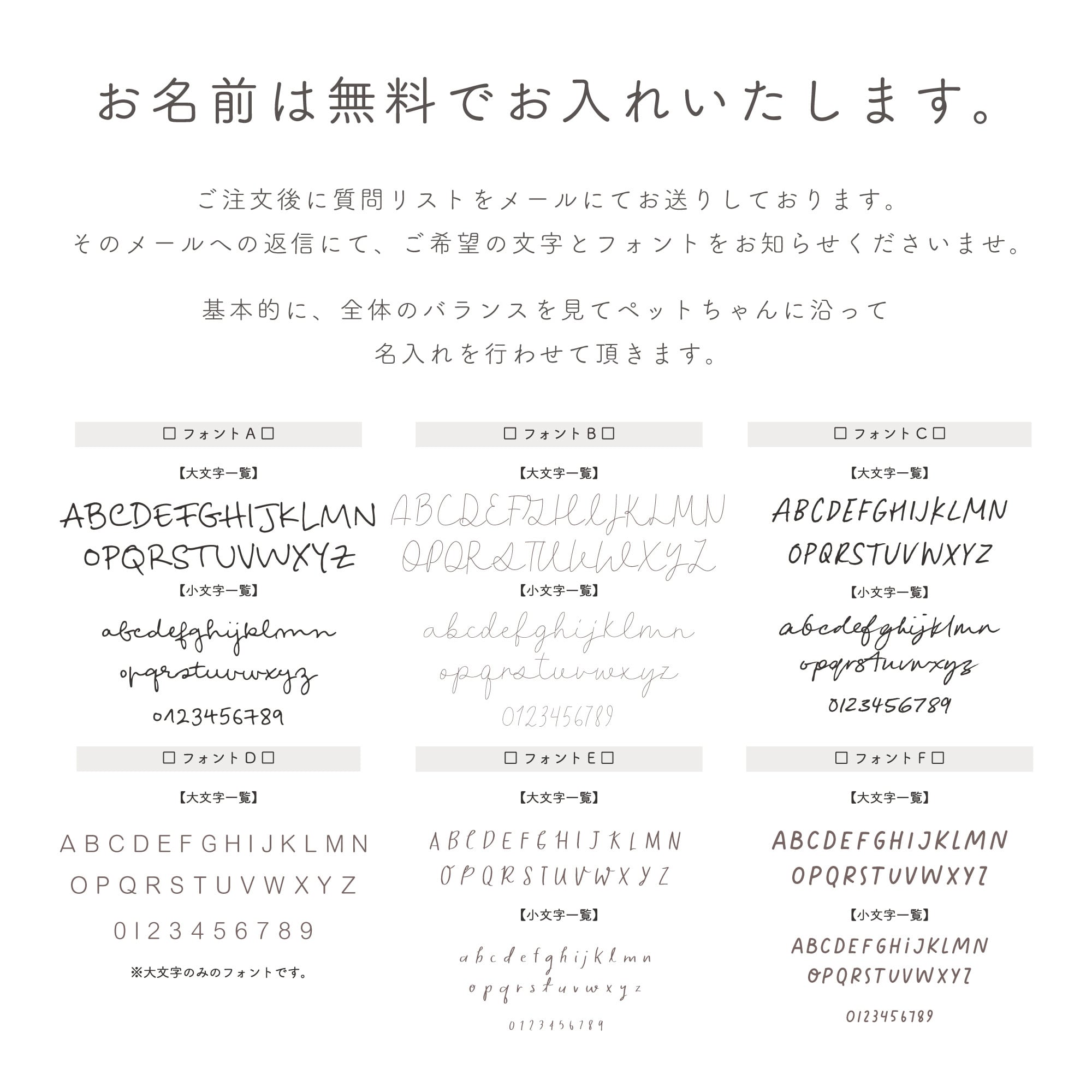 お名前とフォントはご注文後のやりとりにてお伺いしております。